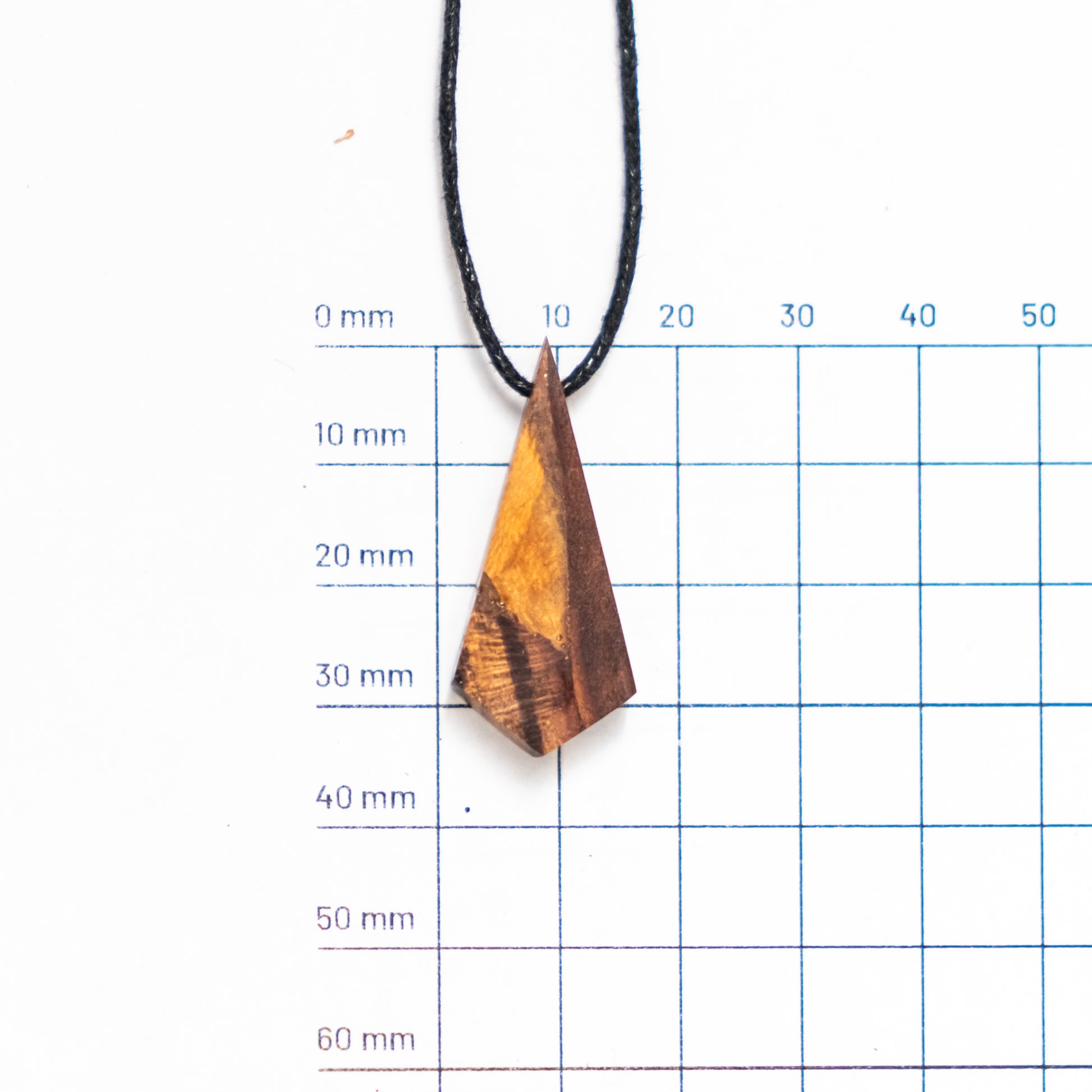 Přívěsek ve tvaru kosodélníku z pryskyřice a borovicového dřeva.