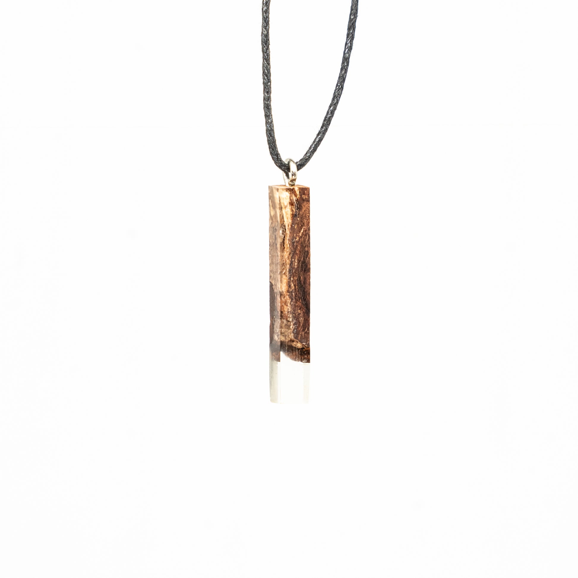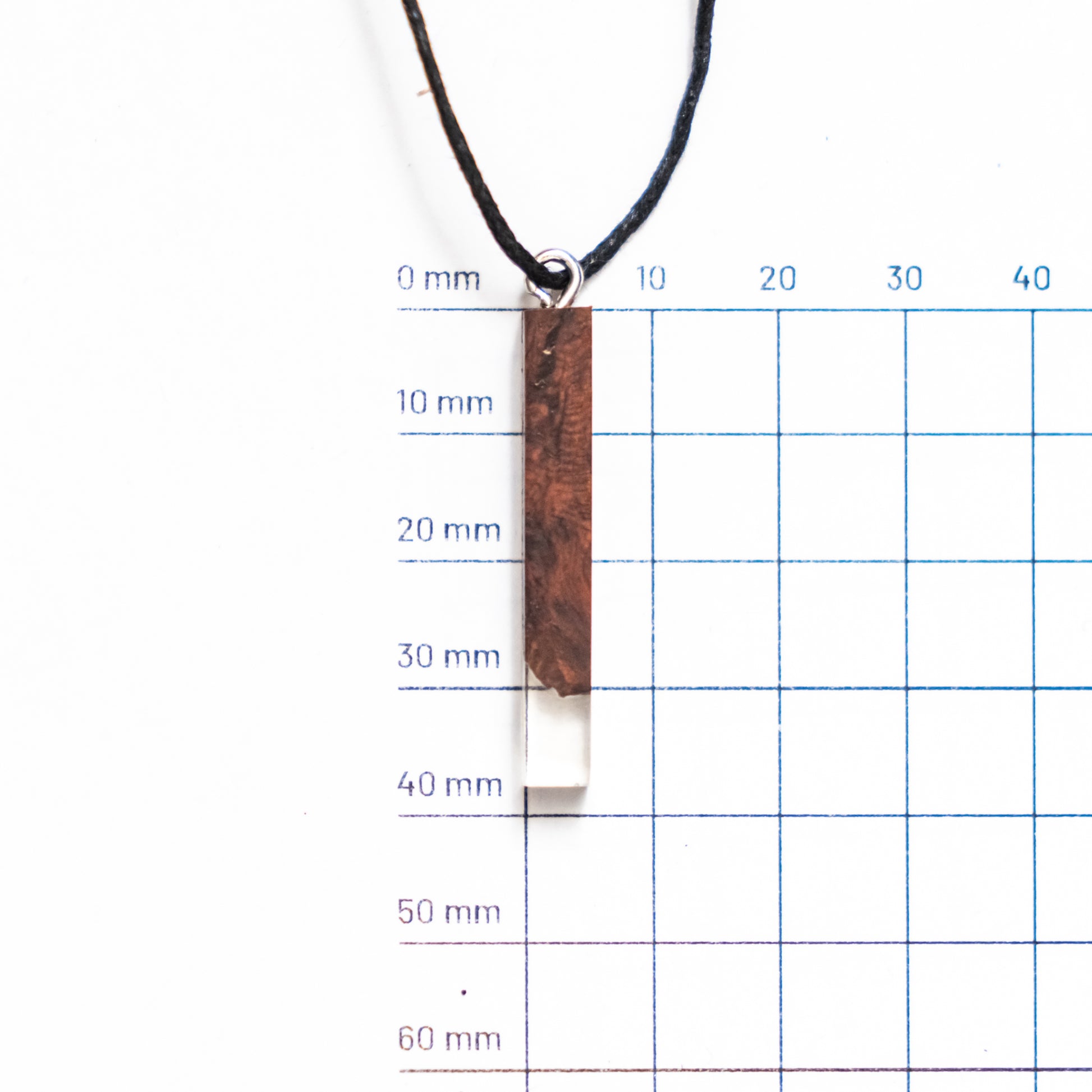 Přívěsek ve tvaru hranolu z pryskyřice a višňového dřeva.
