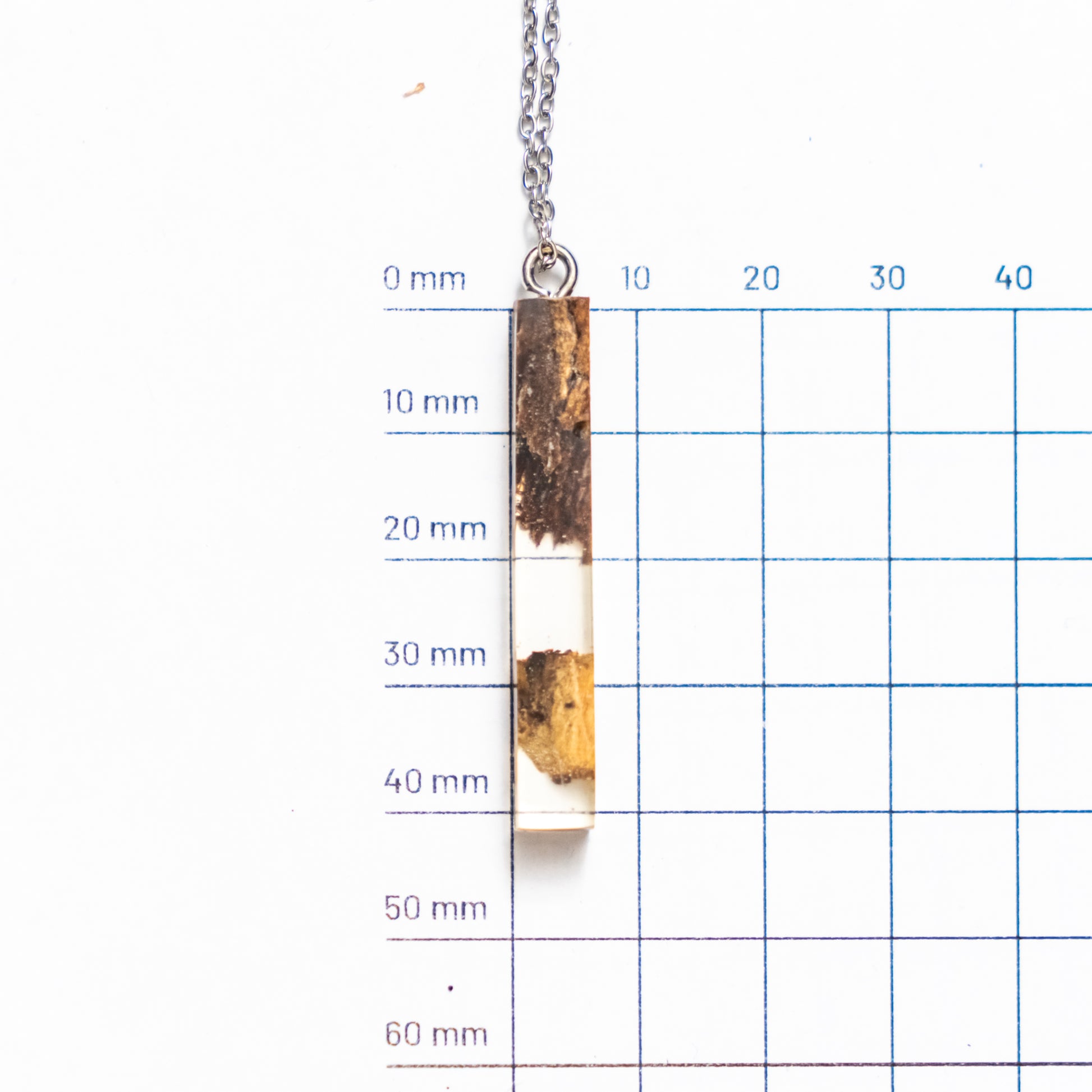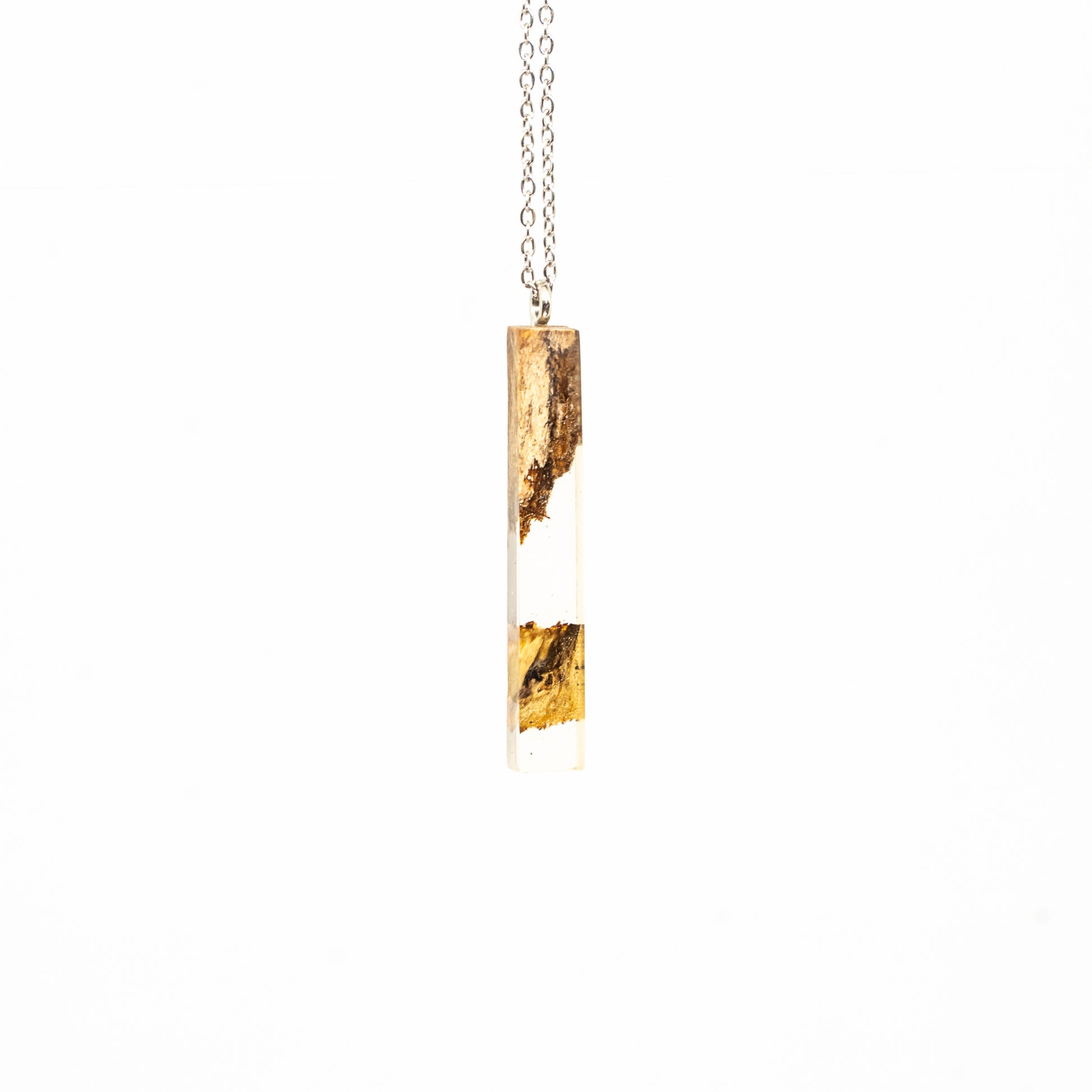 Přívěsek ve tvaru hranolu z pryskyřice a olivového dřeva.
