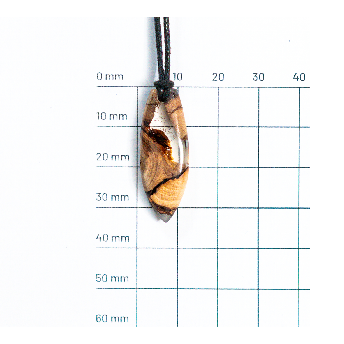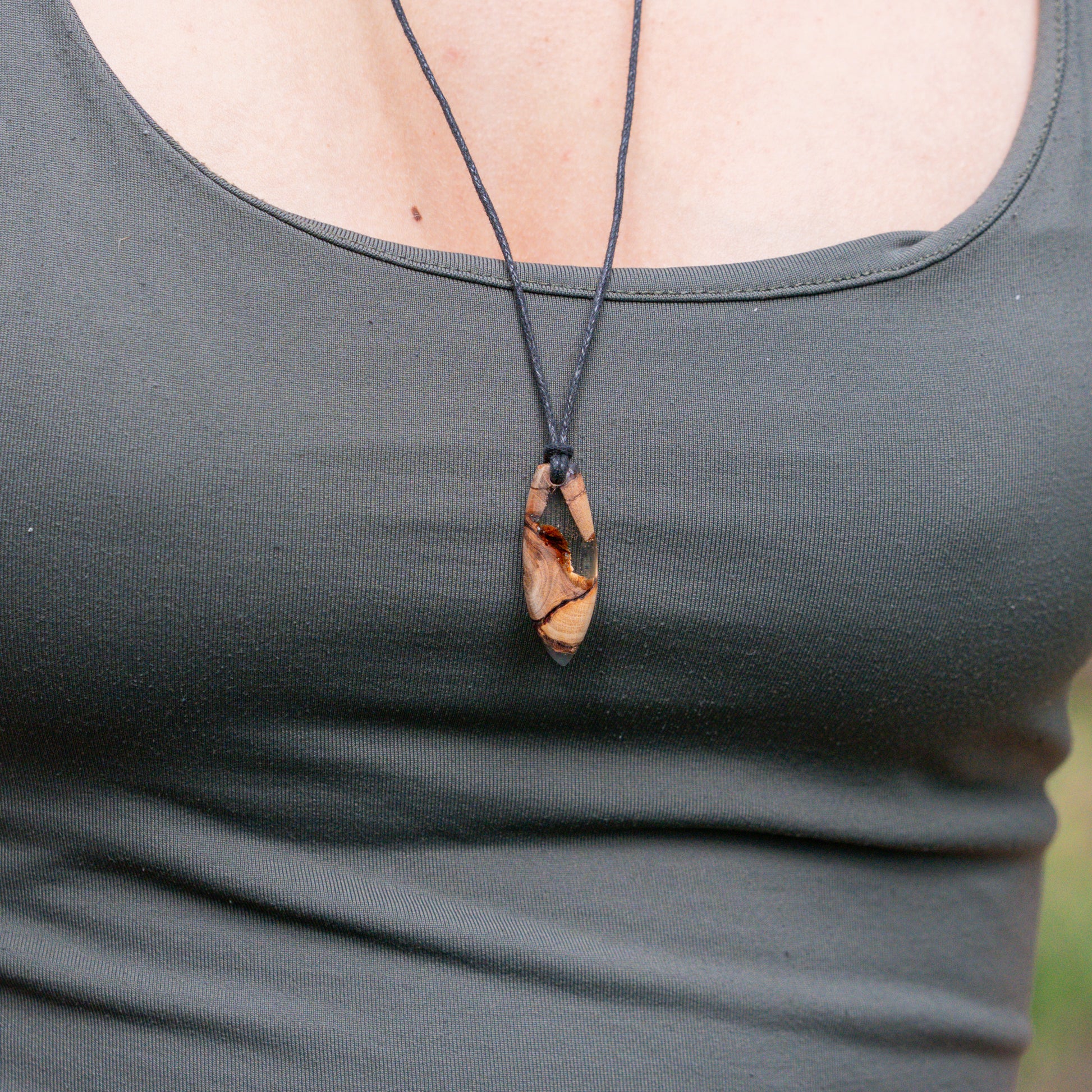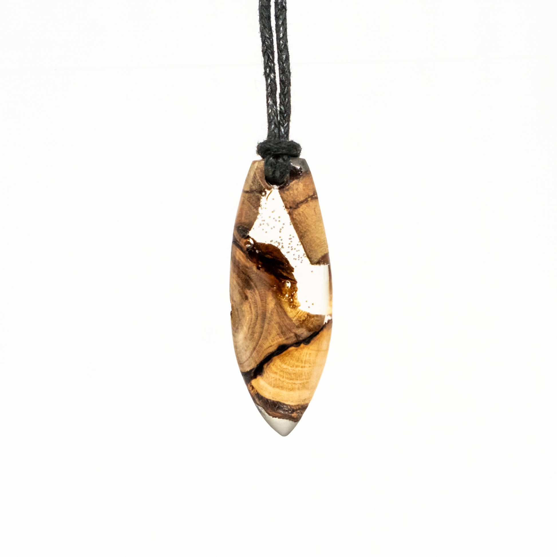Přívěsek na krk ve tvaru surfu, vyrobený z borovicového dřeva a pryskyřice.