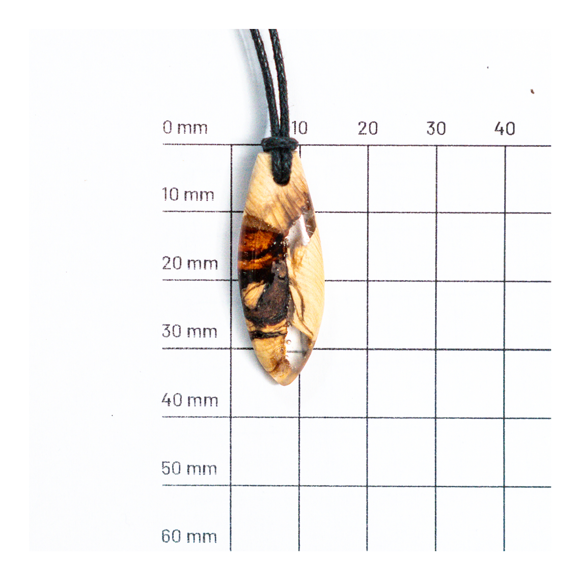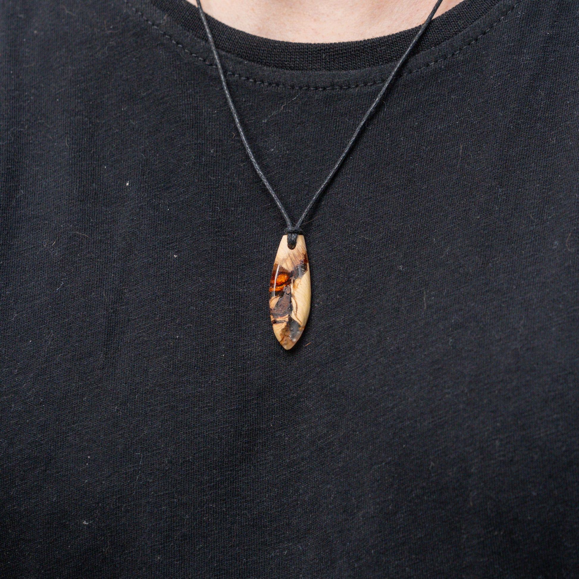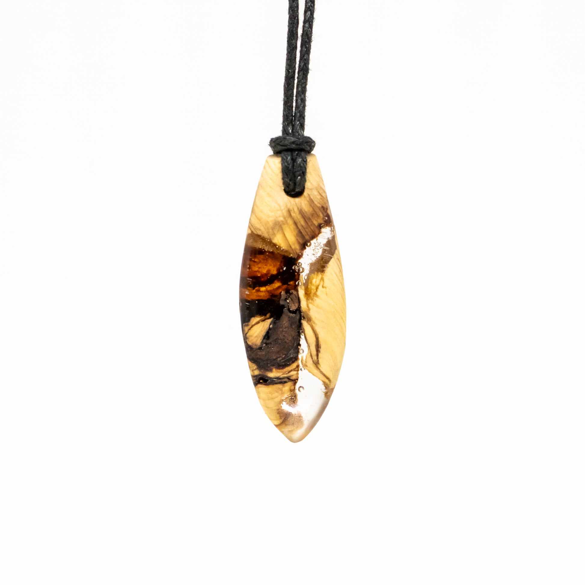 Přívěsek na krk ve tvaru surfu, vyrobený z borovicového dřeva a pryskyřice.