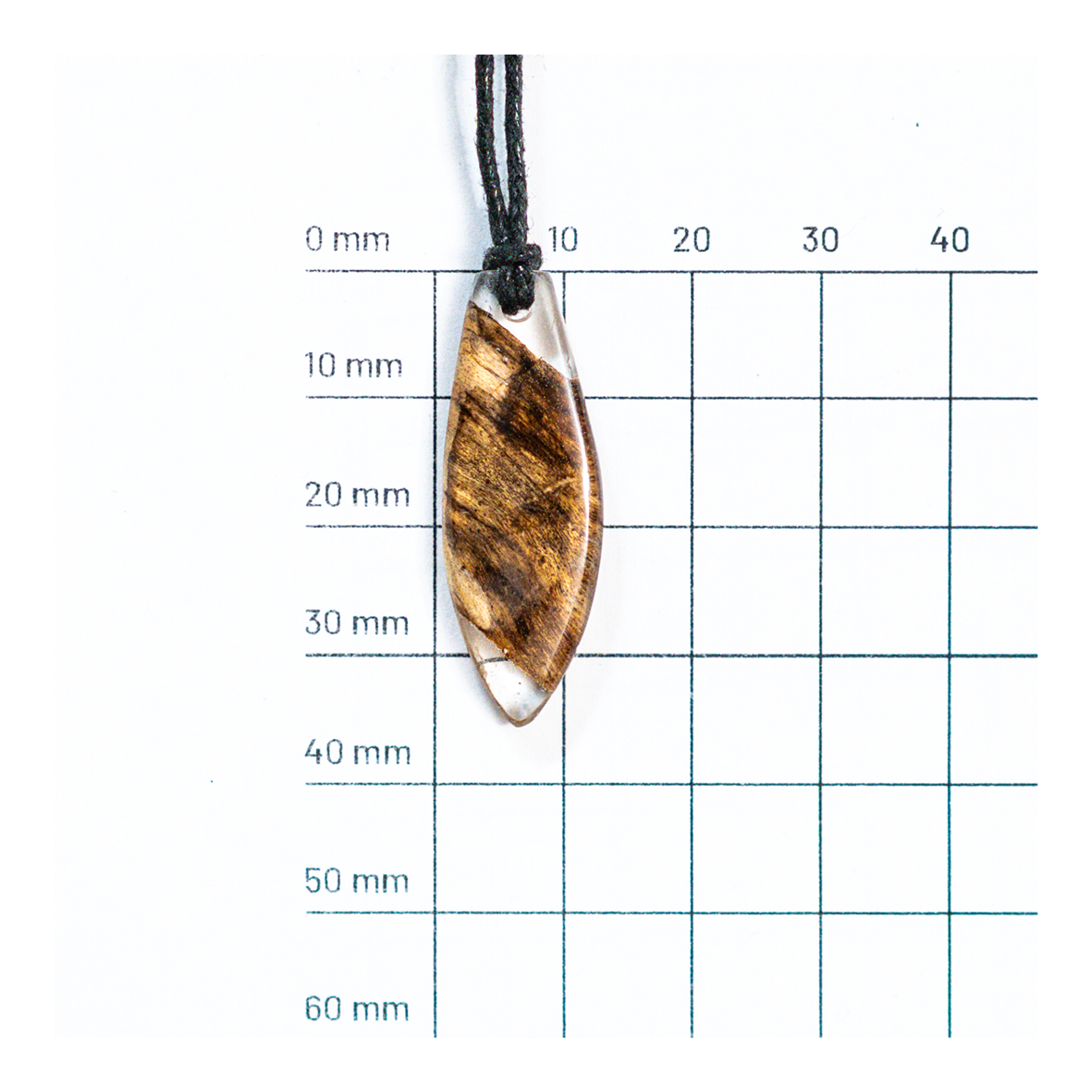 Přívěsek na krk ve tvaru surfu, vyrobený z vyplaveného dřeva a pryskyřice.