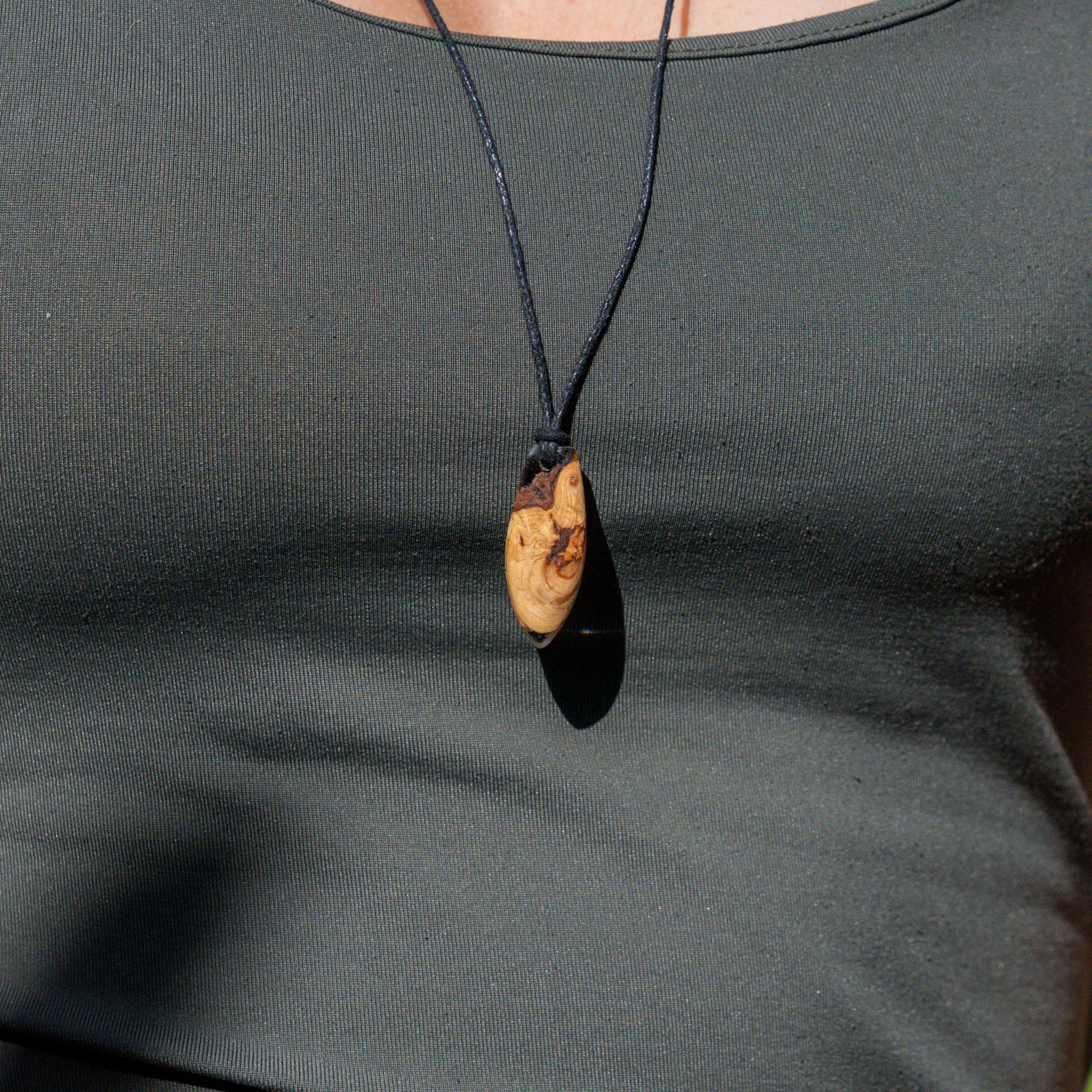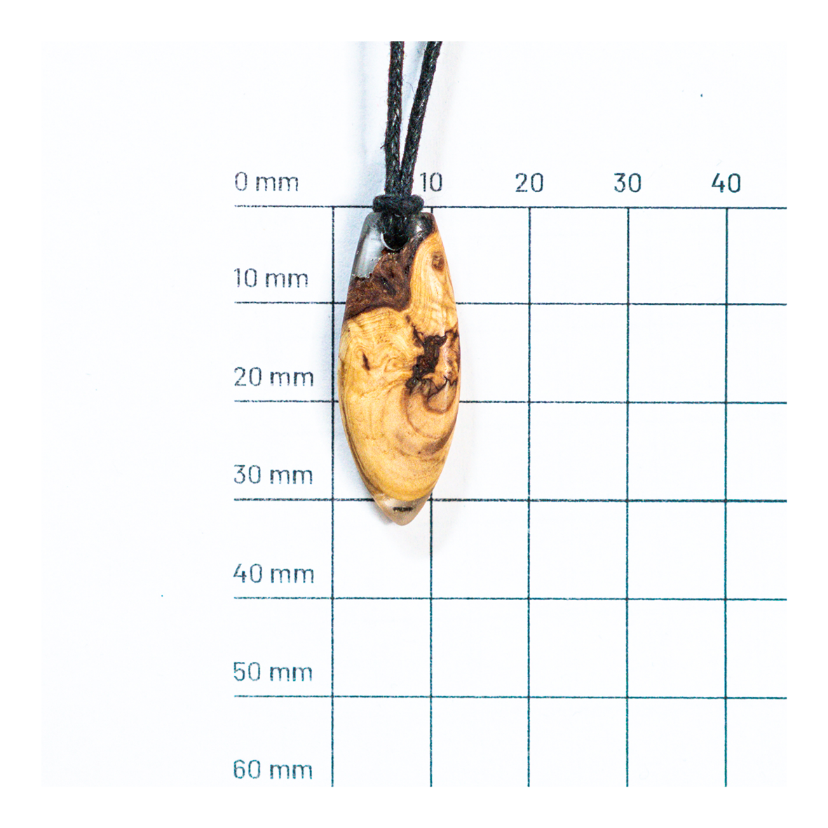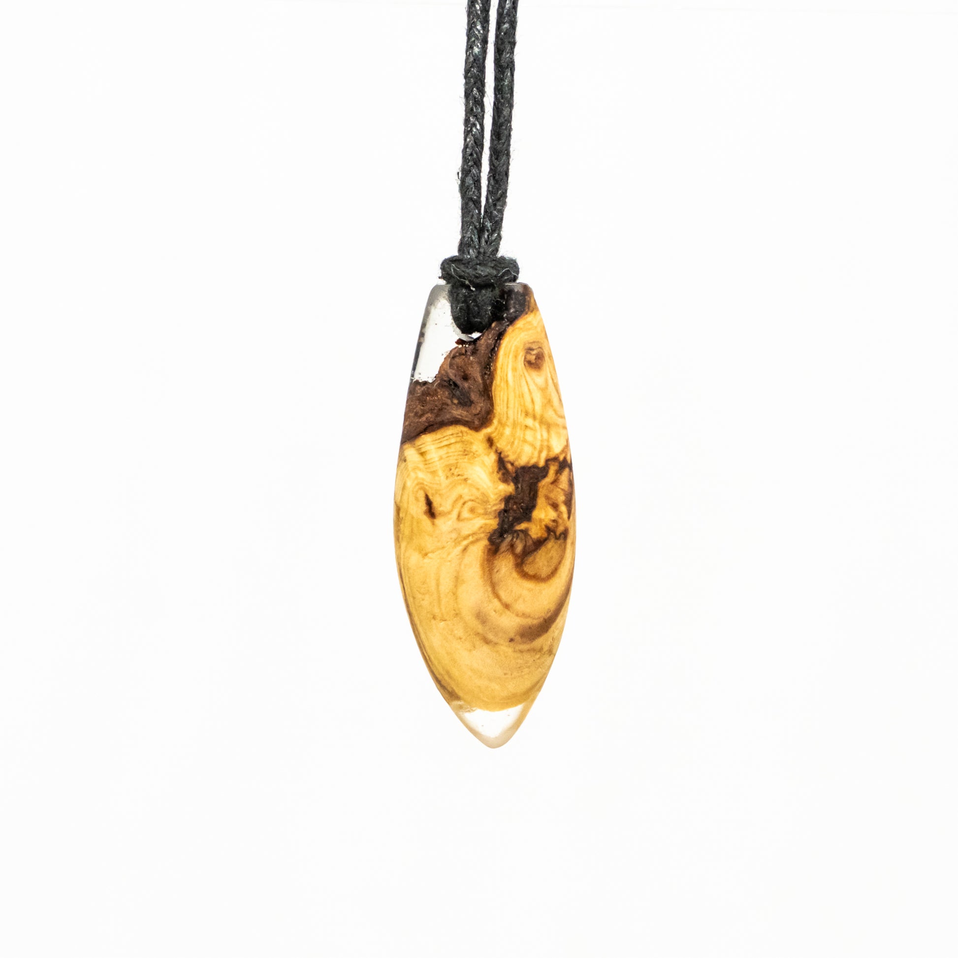 Přívěsek na krk ve tvaru surfu, vyrobený z borovicového dřeva a pryskyřice.